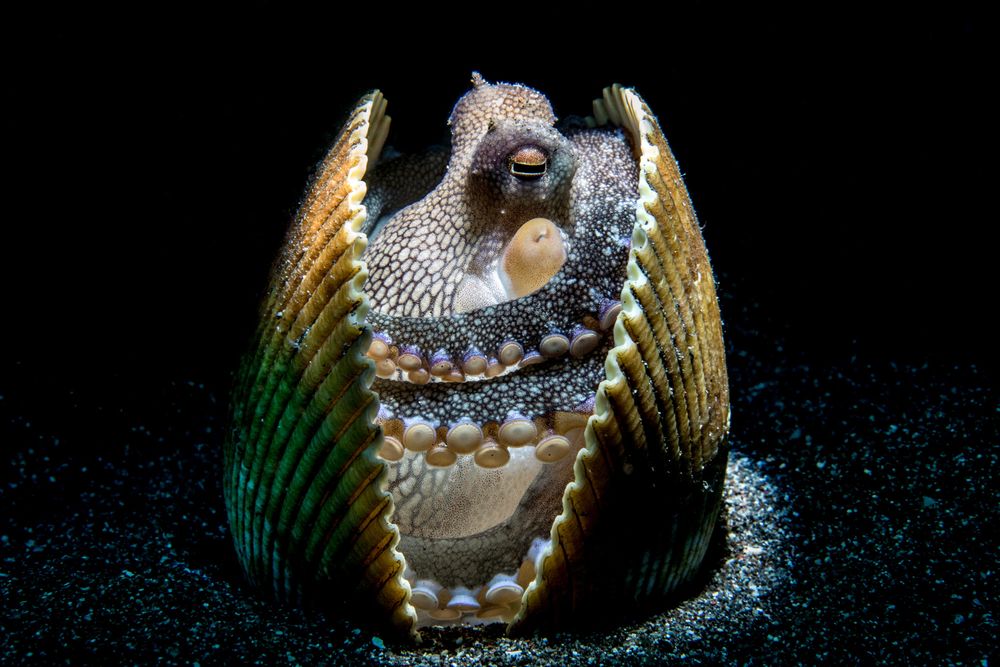 Con vật bên trong cặp vỏ sò là một chú bạch tuộc trái dừa (coconut octopus) nhỏ xíu dài tầm 5cm. Bức ảnh đưuojc chụp ở khu vực đáy cát độ sâu khoảng 18m, sử dụng ống kính macro và một thiết bị lắp vào đèn flash để tạo ánh sáng tập trung có thể tuywf chỉnh (snoot. Điều khó khăn nhất bên cạnh việc thời gian chụp bị hạn chế, là căn chỉnh vị trí của snoot cho chính xác và chọn mức ánh sáng có độ sứng, kích cỡ, hình dạng thích hợp. Tấm hình đã được canh khung chuẩn và không cần phải cắt crop lại.