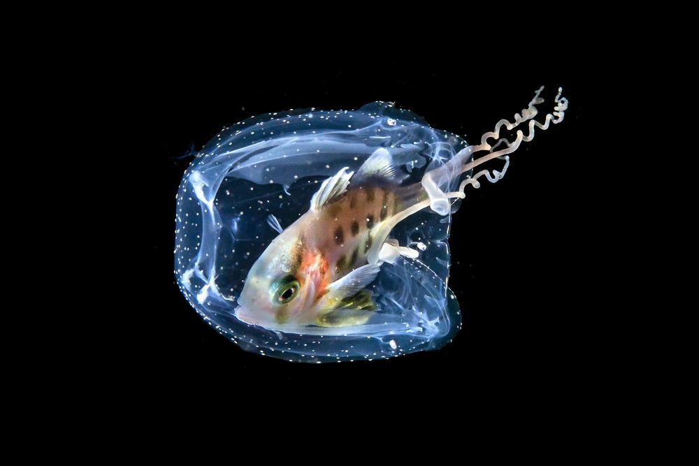 Trong một chuyến lặn “nước đen” ở Lembeh, tôi phát hiện chú cá ngừ con này bơi quanh một con sứa hộp (Box jellyfish) ở đọ sâu khoảng 10m. Bọn cá con rất hay ẩn mình vào bên trong sứa để được bảo vệ. Để chụp được tấm hình này, tôi đã phải chờ đến đúng khoảnh khắc mà con cá “nhìn” vào ống kính xuyên qua con sứa.