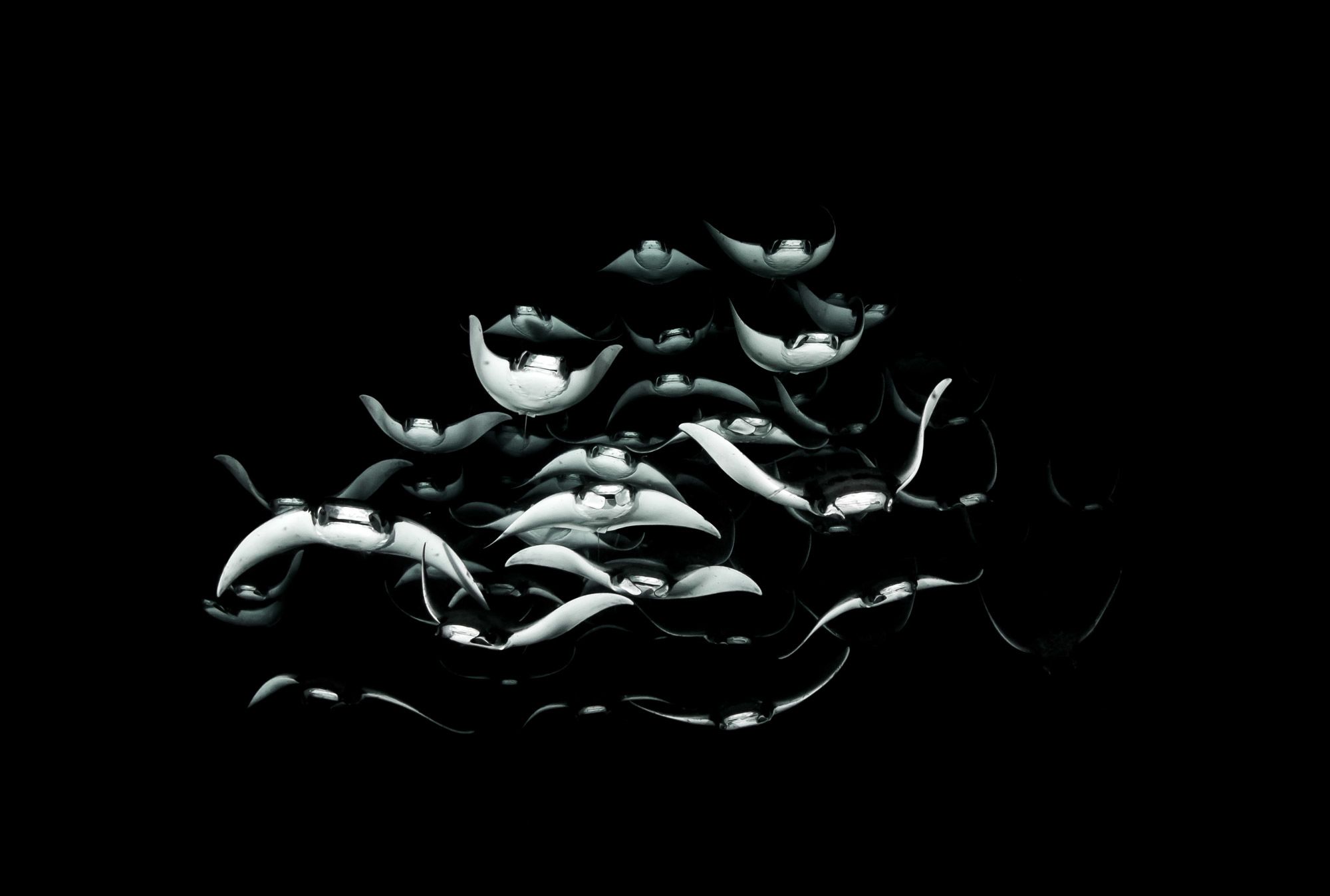 19 bạn lặn từ Nga và tôi trong lúc đang lặn xuống vùng vịnh nông ở khu Biển Cortez, cả nhóm đặt một nguồn sáng để thu hút sinh vật phù du và mọi người chờ ở xung quanh. Đột nhiên, một đàn các “thanh thiếu niên” hám ăn này nhanh chóng ào đến, như tên lửa. Tôi thả trôi ra khỏi dòng phù du và cát cuốn lên thì nhận ra đàn “máy bay thả bom” này đang hồ hởi tiến về phía mình. Tôi bấm máy, ngay sau đó thì cả đàn cá đuối đại dương này lướt lên trên để tránh đâm sầm vào chúng tôi.