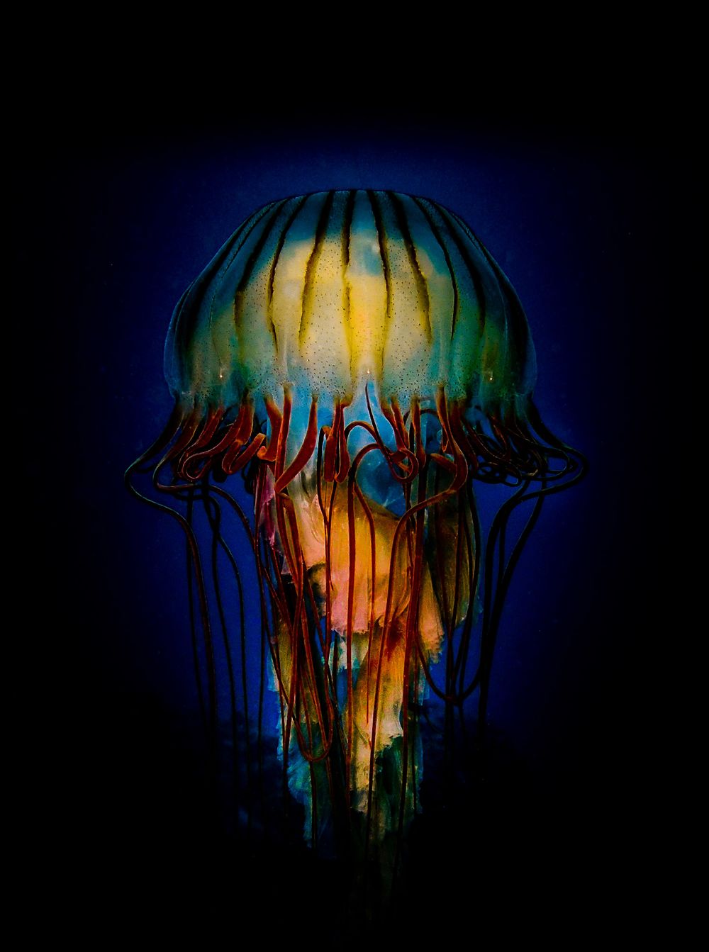 Lúc đầu, chúng tôi định chụp ảnh hải quỳ ở độ sâu khoảng 21m mà vì nước lạnh nên đã nhanh chóng rút ngắn thời gian chụp lại và trên chặng nổi lên thì gặp con sứa này. Màu sắc hiển thị của nó khiến tôi thấy kinh ngạc, và tôi đã nghĩ buổi đi chụp ảnh của mình được cứu vãn rồi đây. Tôi tìm cách chụp một con gần chỗ mình và nó dựng thẳng đứng trông như 1 cái đèn chụp thuỷ tinh nhiều màu sắc. Con sứa chuyển động một cách rất tuỳ hứng và tôi đã phải lặn thêm 1 ca nữa sau khi nghỉ trên bề mặt để có thể có được tấm ảnh này.