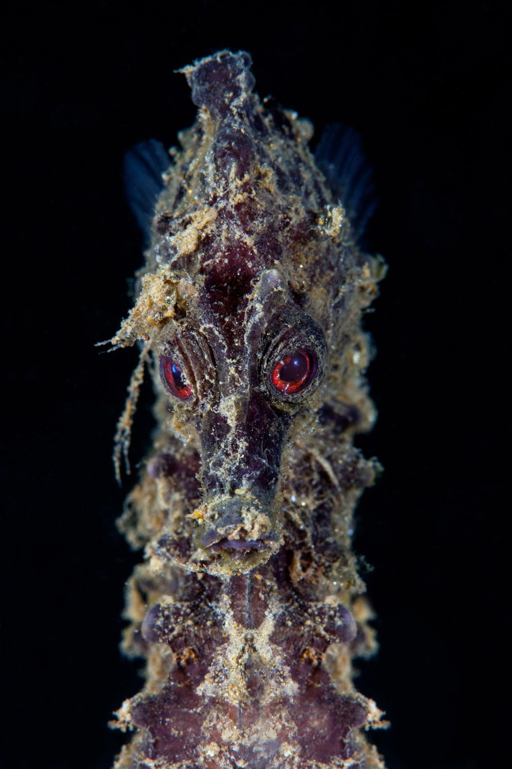 Con rổng biển lá (leafy sea dragon) này nằm trong danh sách các ảnh muốn chụp của tôi từ lâu. Năm 2018m, tôi đến miền nam Úc với mục tiêu để chụp được ảnh của nó. Thường thì tôi không sử dụng đèn ánh sáng tụ vì cá ngựa vốn hay mắc cỡ và sẽ bỏ chạy hay quay đi. Ngay cả khi chủ thể của bạn đã cố định ngay trung tâm, mắt chúng cũng sẽ di chuyển vòng quanh và không phải lúc nào cũng chịu nhìn vào bạn. Vậy mà may mắn, tôi đã ghi lại được tích tắc đó.