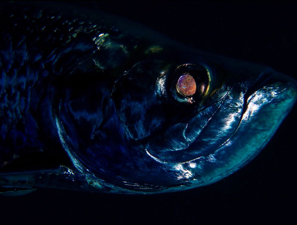 Tôi đang lặn lúc đó ở Devil’s Grotto, từ Gray Cayman, nơi được biết đến bởi sự đông đúc của cá mòi. Chúng tôi tìm thấy một chú cá mòi lớn hiếm thấy đang trốn dưới bóng tối của 1 gờ đá nhô rộng ra. Chỗ đó khá nông, nên tôi phải vịn nhẹ bên dưới cái vòm gờ đá và cố thử xem liệu mình có chụp được chỉ với ảnh sáng tự nhiên quanh đó hay không. Thành quả rất đẹp luôn! Tấm ảnh tiêu cự chính xác vào con mắt và bạn có thể nhìn rõ cả các hoa vân của vảy cá.
