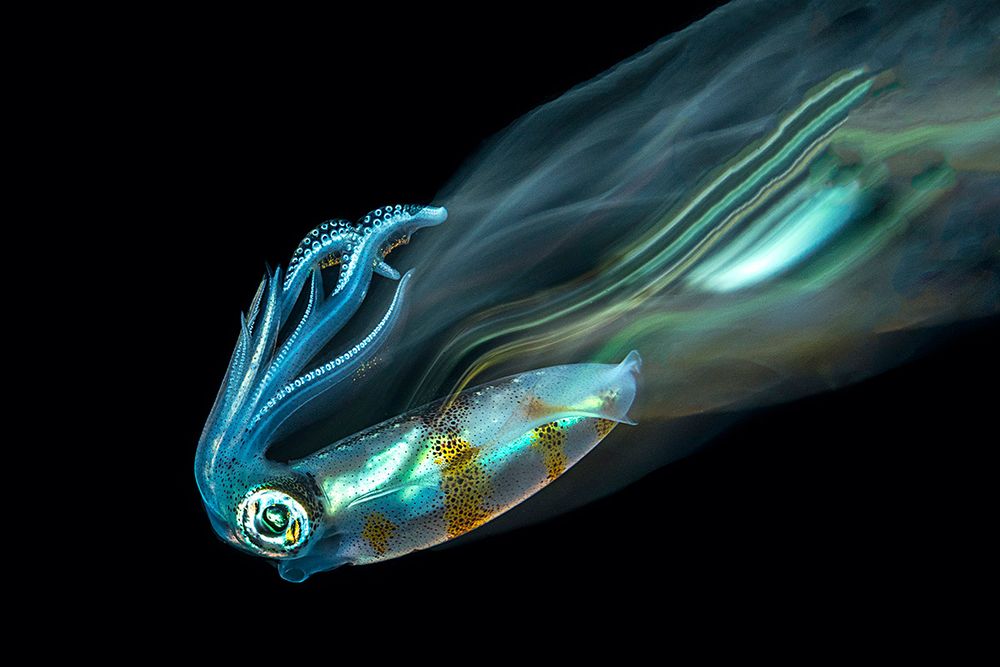 Trong một ca lặn “nước đen” ở gần Tulamben, một con mực rạn bơi lại gần, nó cỏ vẻ thích ánh sang. Sau vài tấm ảnh với các cấu hình quen thuộc dành cho chụp ảnh ở vùng nước đen, tôi thấy con mực vẫn quanh quẩn suốt. Thế là tôi thử cài sang thông số khác cho máy ảnh và thử nghiệm với tốc độ màn trập chậm lại để lấy được cái bóng mềm mại của con mực. Sau vài nỗ lực thì cũng có được kết quả tốt.