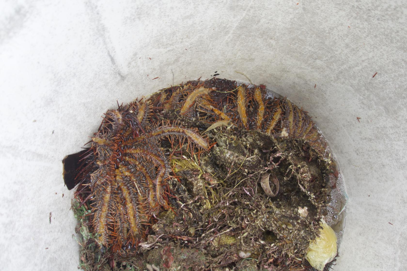 Sao biển gai được bỏ vào thùng nhựa để tránh bị gai đâm xuyên các túi lưới hay túi rác